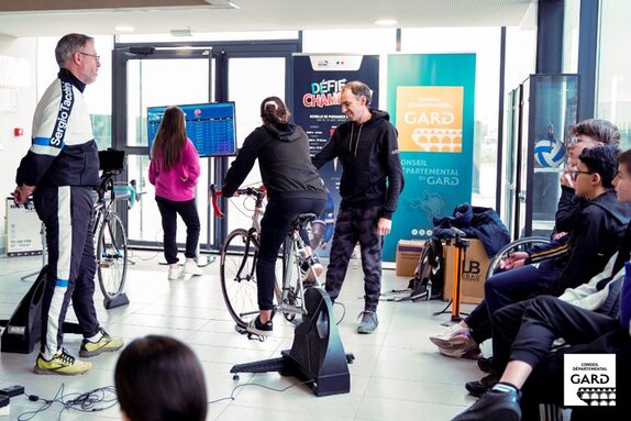 Chaque classe a pris part à deux activités différentes. La première était une activité pratique autour du cyclisme. Deux vélos connectés étaient installés et les élèves faisaient des roulements en groupe pour que chacun puisse essayer. Cette activité leur a permis de pratiquer le sport de manière ludique et dynamique.