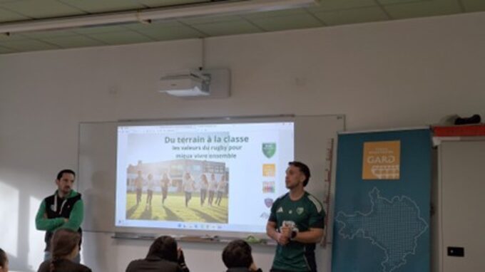 Deux joueurs du club de rugby des Angles sont intervenus au collège de Villeneuve-lès-Avignon toute la journée afin de rencontrer les classes de 4e, pour une heure d’intervention par classe.