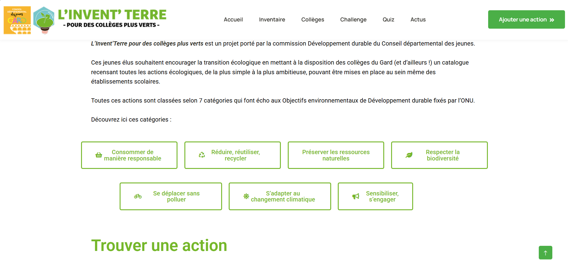Nous avons ensuite revu les catégories des actions répertoriées sur le site l’Invent'Terre pour des collèges plus verts. Ces catégories correspondent aux grands enjeux de transition écologique auxquels nous allons essayer de sensibiliser les collégiens à travers des affiches et des quiz :